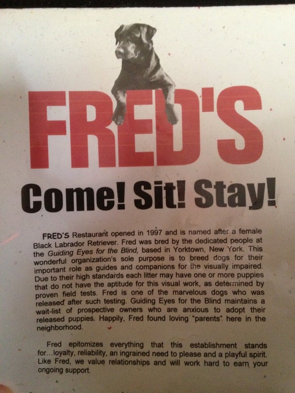 Great food..low key place with good food & great decor with photos of customers dogs. -Heather