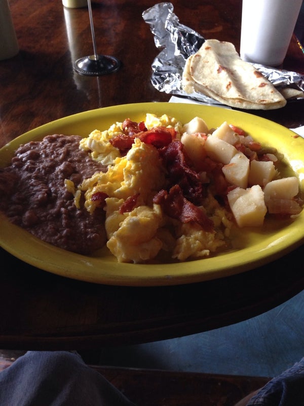 Scrambled eggs with bacon...scrambled eggs with potatoes and the Carne guizada plate..not to mention the fresh tortillas! And the great service! -Marie