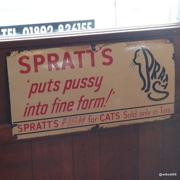 LIKE AMUSING TIN PLATE SIGNS? Look out for the "Keeps pussy in fine form" cat food ad. -Wilkes