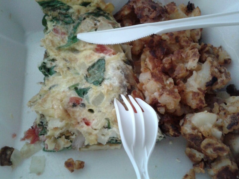 Looking to go healthy? Try an egg white omelette with veggies (& no cheese!). I usually get spinach, mushrooms, tomatoes & onions. No sides, no toast & I drink water. Pure protein boost! -Amanda