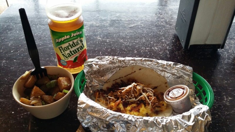 Their SoCo taco - sausage, biscuits, gravy and cheddar cheese, is ingenious for breakfast on the run. -Eddy