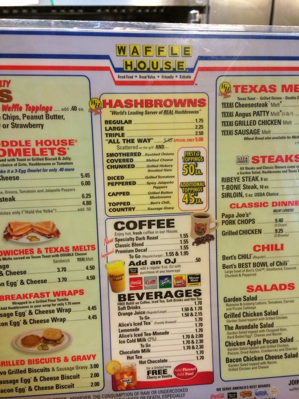 Love waffle house. Cheap as hell. and YUMMY! and FRESH! -John