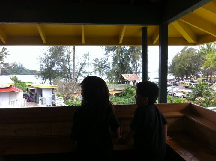 Take-out primarily, but some seats upstairs with view of Kalapaki Beach. -Kathy