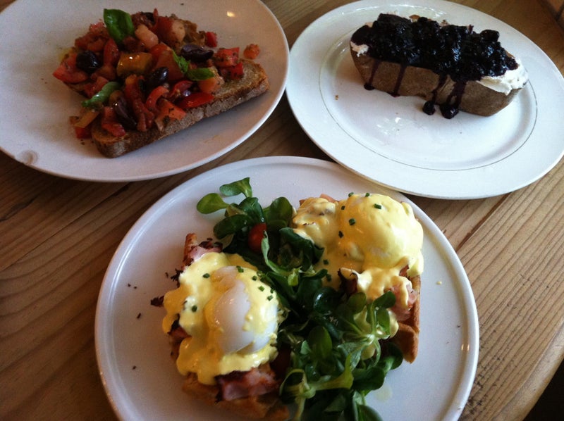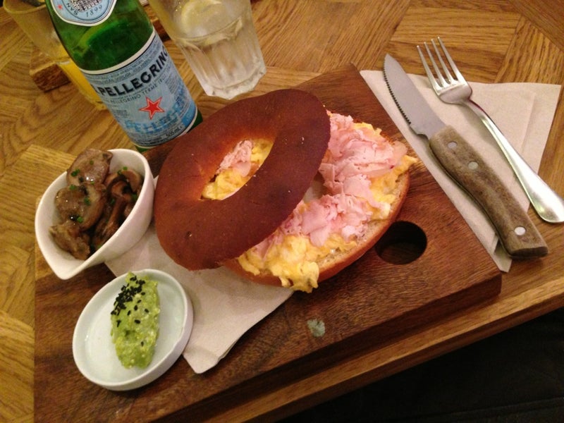 El Bagel con bacon, rúcula, queso y revuelto de huevos con setas es insuperable y los postres también. -Maria