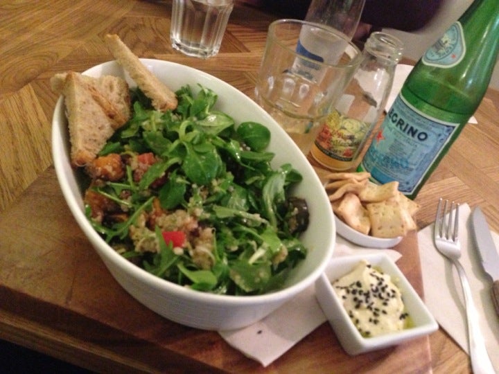 Try the Quinoa Salad! Great greens and crunchy real bread croutons. -Ilse