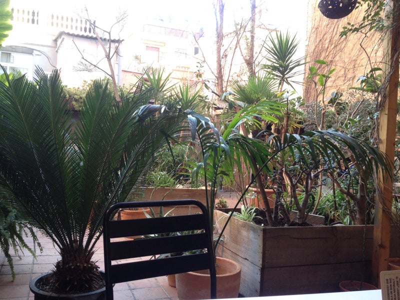 Buenos desayunos y bonito jardín interior con mesas. -Antonia